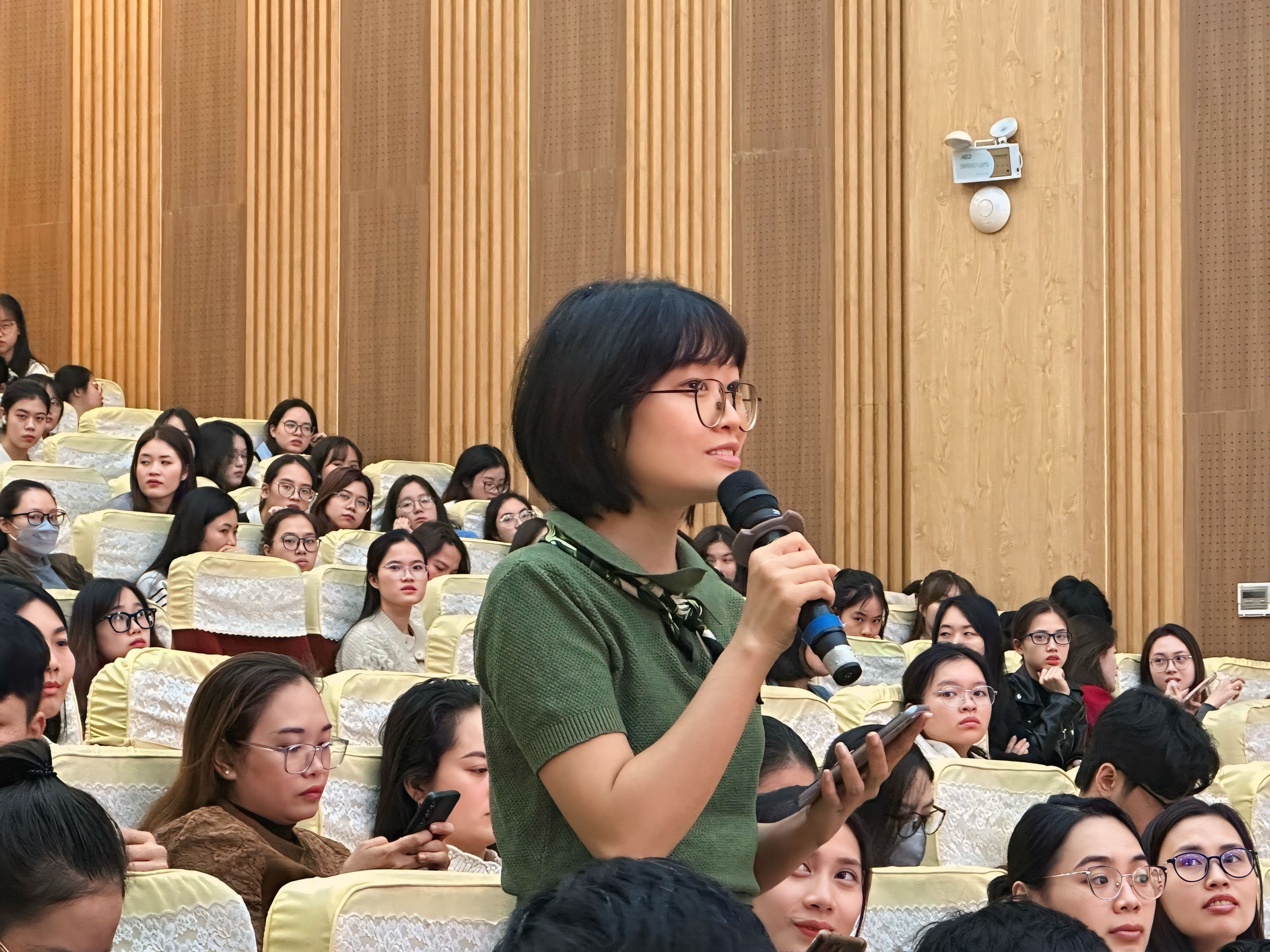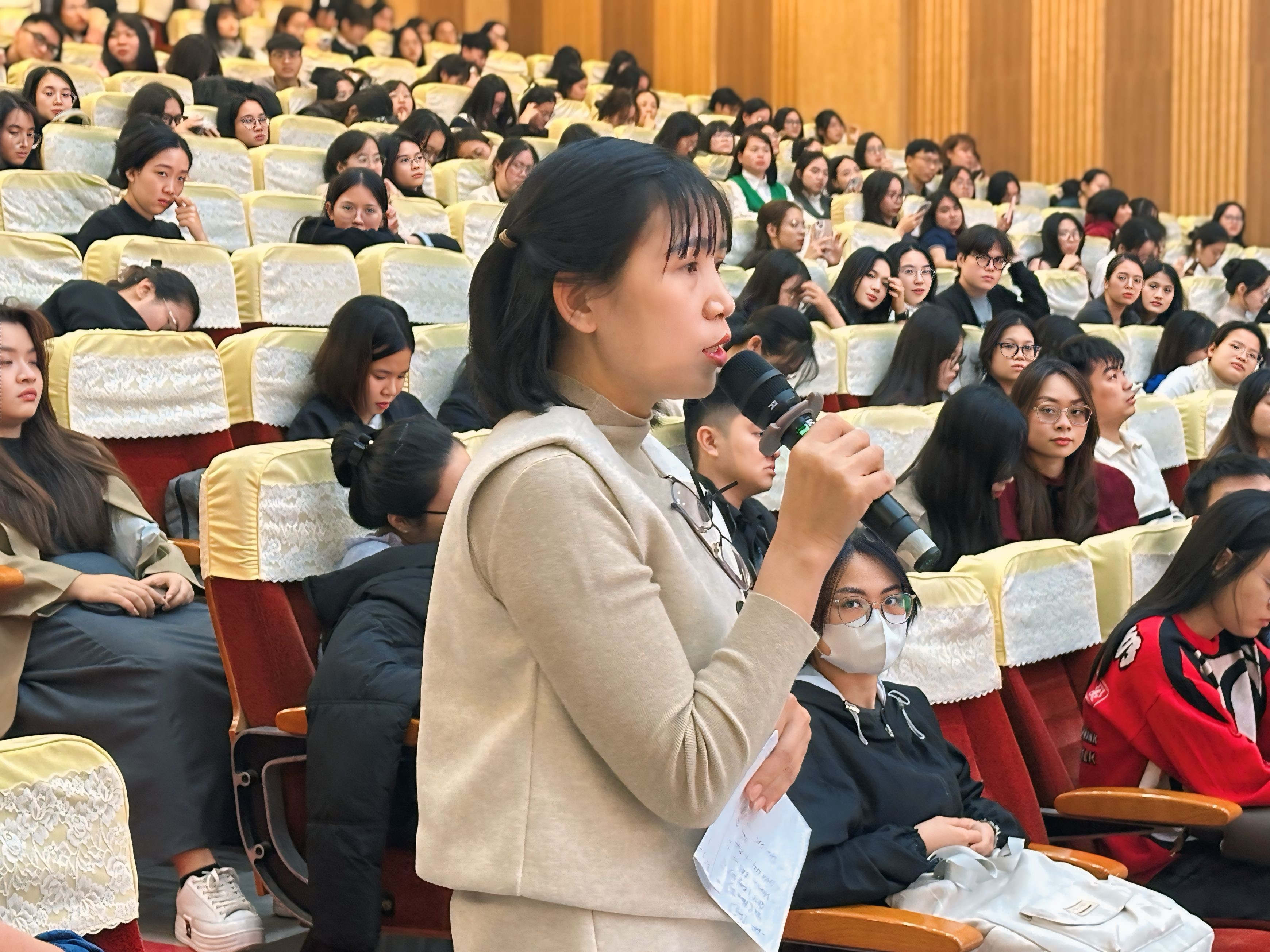 Ở phần trao đổi, thảo luận giữa học viên và Nhà trường, nhiều câu hỏi thiết thực đã được các học viên cao học quan tâm và trực tiệp đặt ra. Trong đó, nổi bật là các nội dung liên quan đến yêu cầu chuẩn đầu ra ngoại ngữ, lộ trình hoàn thành các học phần, vấn đề được quy đổi hay miễn học phần,... cũng như việc sử dụng các công cụ trí tuệ nhân tạo (AI) trong học tập và nghiên cứu khoa học.