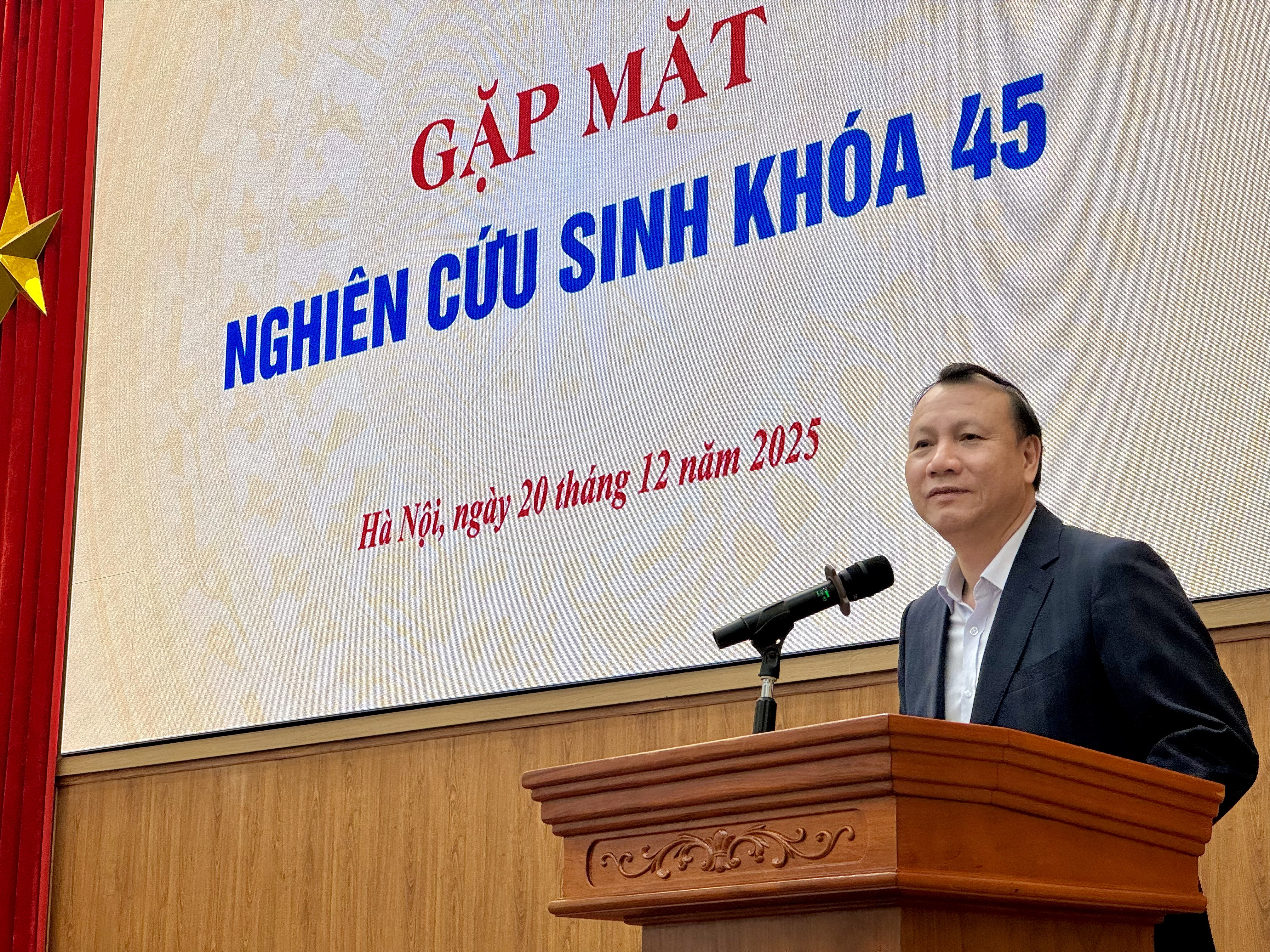 Phát biểu khai mạc chương trình, PGS.TS. Nguyễn Đức Sơn, Hiệu trưởng Nhà trường gửi lời chúc mừng sâu sắc tới toàn thể các nghiên cứu sinh K45. Thầy khẳng định: con đường nghiên cứu sinh là một hành trình đòi hỏi sự kiên trì, bền bỉ và đam mê khám phá tri thức. Vượt qua những thách thức khó khăn trên chặng đường này không chỉ là một thành công cá nhân lớn lao của mỗi nghiên cứu sinh, mà còn là đóng góp quý giá vào sự phát triển chung của nền khoa học và giáo dục. Nhà trường luôn trân trọng và coi đội ngũ nghiên cứu sinh là một lực lượng nghiên cứu chất lượng cao, nòng cốt trong các hoạt động khoa học, hội thảo của Trường. Sự gắn bó lâu dài giữa nghiên cứu sinh và Nhà trường chính là nền tảng vững chắc cho những hợp tác sâu rộng trong tương lai. PGS.TS. Nguyễn Đức Sơn bày tỏ mong muốn rằng các nghiên cứu sinh ưu tú sau khi hoàn thành chương trình sẽ trở thành những giảng viên, nhà khoa học tiếp nối truyền thống của Trường Đại học Sư phạm Hà Nội. Thầy cũng gửi lời chúc các nghiên cứu sinh sẽ luôn giữ vững ngọn lửa đam mê, sớm hoàn thành luận án với kết quả xuất sắc và về đích thành công trong thời gian sớm nhất.