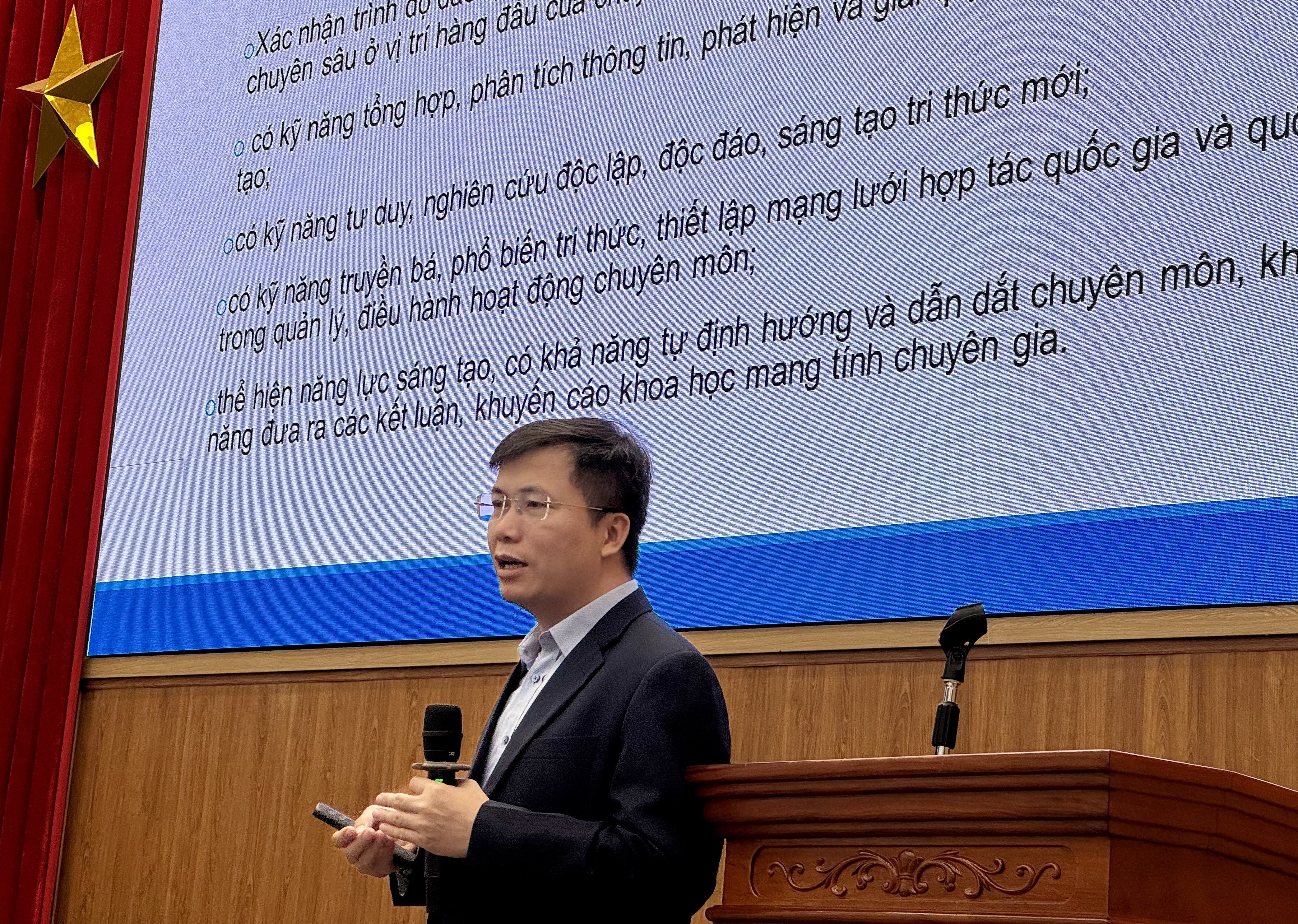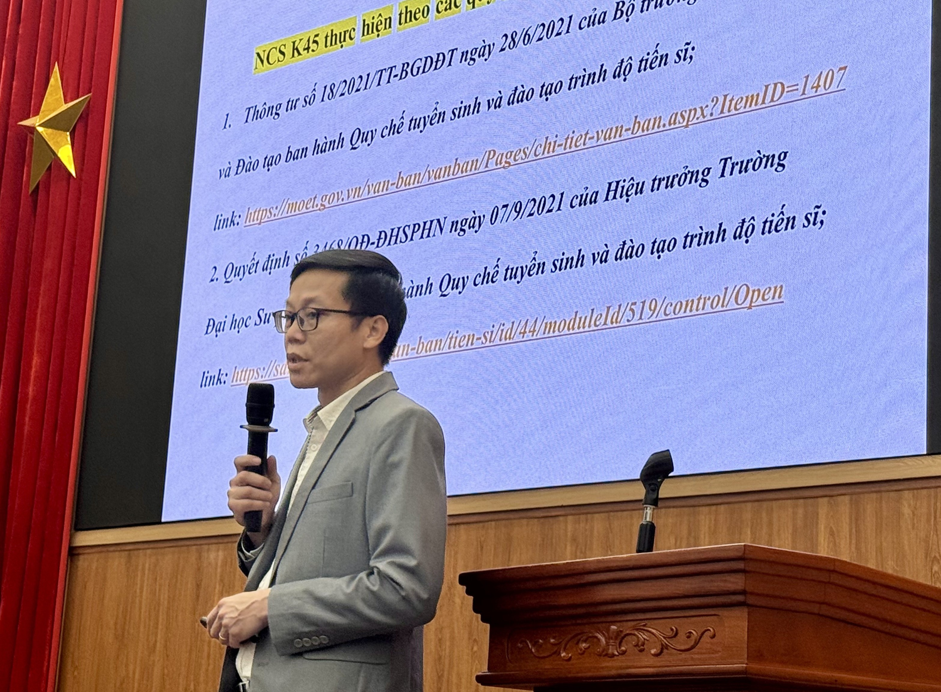 Tiếp theo chương trình, TS. Trần Quốc Khả, Phó Trưởng phòng Sau đại học, đã giới thiệu chi tiết và phổ biến các quy chế, quy định quan trọng trong đào tạo trình độ tiến sĩ. Phần trình bày tập trung vào các yêu cầu về tiến độ, quy trình nghiên cứu, tiêu chuẩn về kết quả học tập, công bố khoa học cũng như các quy định về đánh giá, nghiệm thu luận án, giúp các nghiên cứu sinh có cái nhìn toàn diện và rõ ràng về lộ trình cần thực hiện.