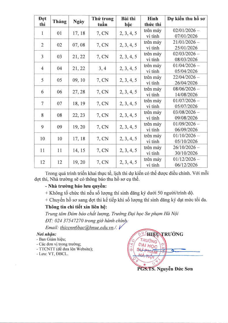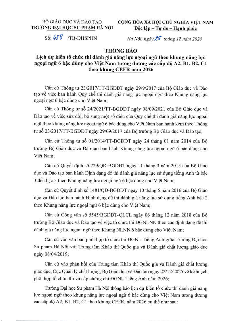 THÔNG BÁO Lịch dự kiến tổ chức thi đánh giá năng lực ngoại ngữ theo khung năng lực ngoại ngữ 6 bậc dùng cho Việt Nam tương đương các cấp độ A2, B1, B2, C1 theo khung CEFR năm 2026